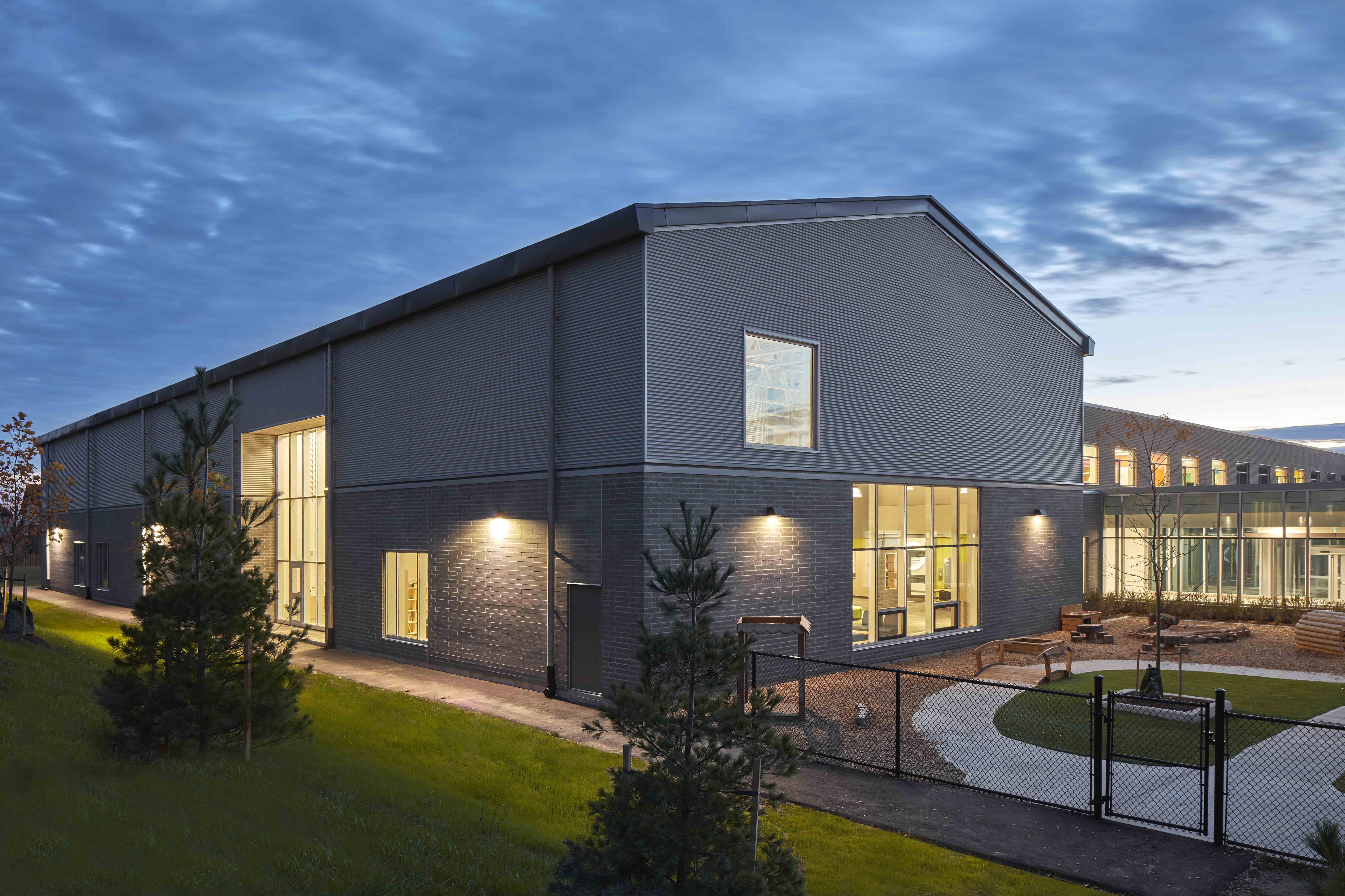 The new Groh Public School accommodates 600 K-8 students and a 48 pupil-place child care centre for the YMCA in the growing community of Doon South, Kitchener. The project takes its cues from nearby agricultural buildings and the adjacent old Groh Farming access trail – newly interpreted as a multi-use recreational trail. The building orients views towards the trail, and charges its edge with large active common programs – including the gym, library and atrium – and various outdoor play & learning spaces. Site Planning and material selection were also influenced by the rural context.