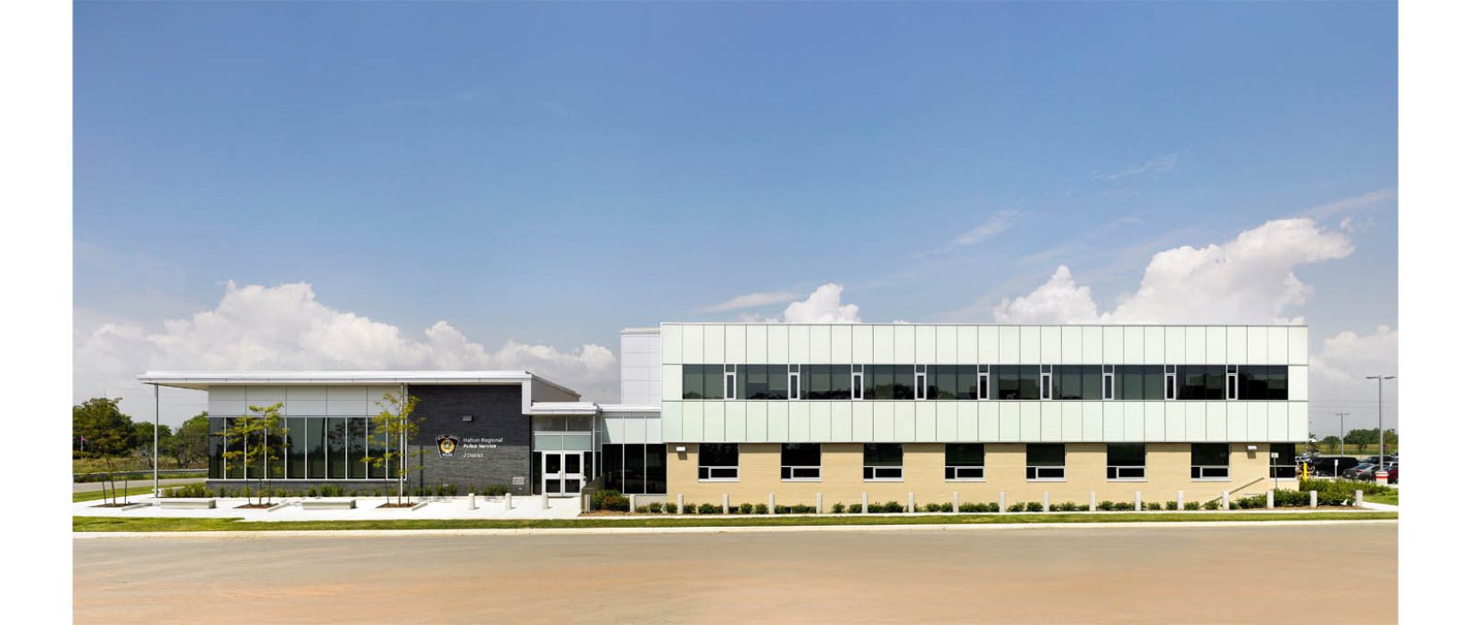 The police station is carefully located to maximize public presence on the regional road to the north, and in massing relates to the context of the adjacent residential neighbourhood. The facility is designed with flexibility to accommodate future growth for the next 10 years. In addition to the conventional program requirements, the station houses police training facilities and a prominent community room to encourage public use of the building and interaction with local police by area residents.