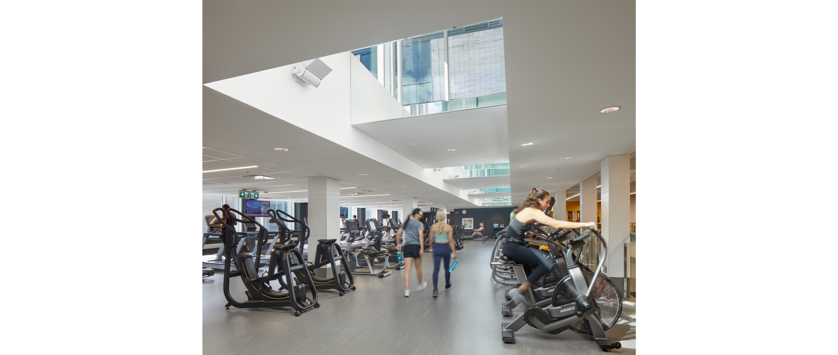 The most current phase to the Student Life Centre is a 77,000 sf addition completed in 2021. The building now contains; expanded food services and student dining areas, informal study and lounge spaces, Physical Activities Complex (PAC) entry and control, a reimagined and expanded fitness centre, a fitness studio and climbing walls. The upper levels contain various sized multi purpose and event rooms, lounges as well as PAC administrative offices. A multi-faith chapel and graduate student offices are featured on the third floor. The design strategy has been to create an integrated, flexible and highly functional student centre, as a welcoming and compelling place which frames an equally inviting and significant outdoor social space (Great Lawn) for students to enjoy and to traverse the central campus.